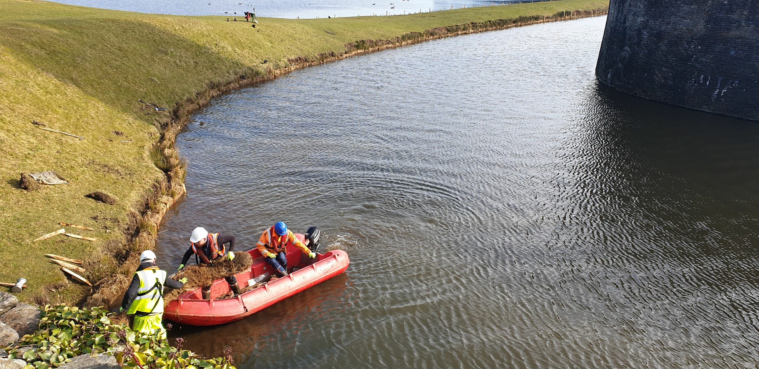 In order to resolve this, Salix supplied and installed over 700m of pre-established coir rolls as an organic revetment, preventing soil erosion along the toe of the moat. The 3m long x 300mm diameter rolls contain a variety of native marginal plants including Lythrum salicaria, Iris psuedacorus, Juncus effusus, Carex acutiformis and Phalaris arundinacea. These plants provide a good selection of flowering species to attract pollinators and strong root structures to bind the soils and prevent further erosion. The mature planting within the coir rolls is established in wet-beds at our 28 acre in-house wetland nursery for a minimum of 6 months. This solution speeds up the rate of establishment on site and provides instant wetland habitat, which will also improve water quality over time.
