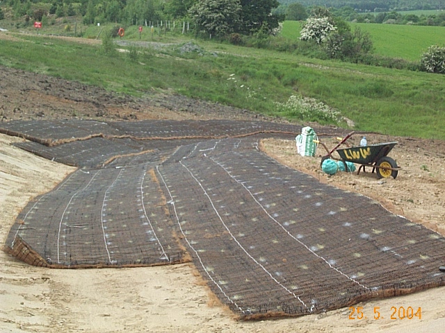 The eroded channels were re-profiled and shaped in March 2004 and seeded and protected with the C350 within a two week period. The seed and fertiliser were protected from washout by flows in the channel from day one. An added benefit was the rate at which vegetation began to establish due to the mulching effect of the coir fibre composite layer in the 3-D net of the C350.