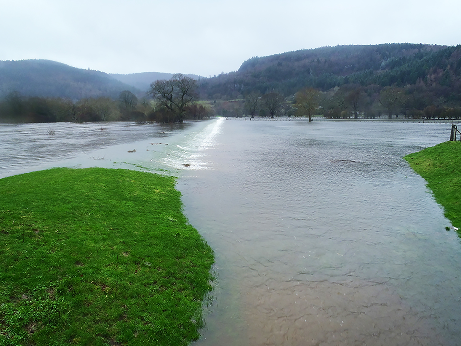 It allows water to flow over man-made flood banks onto the natural flood plain of the valley floor, where it is then stored and drains away over a few days. To allow for this, the flood bank immediately upstream was lowered and a new flood bank built to protect homes in Trefriw.