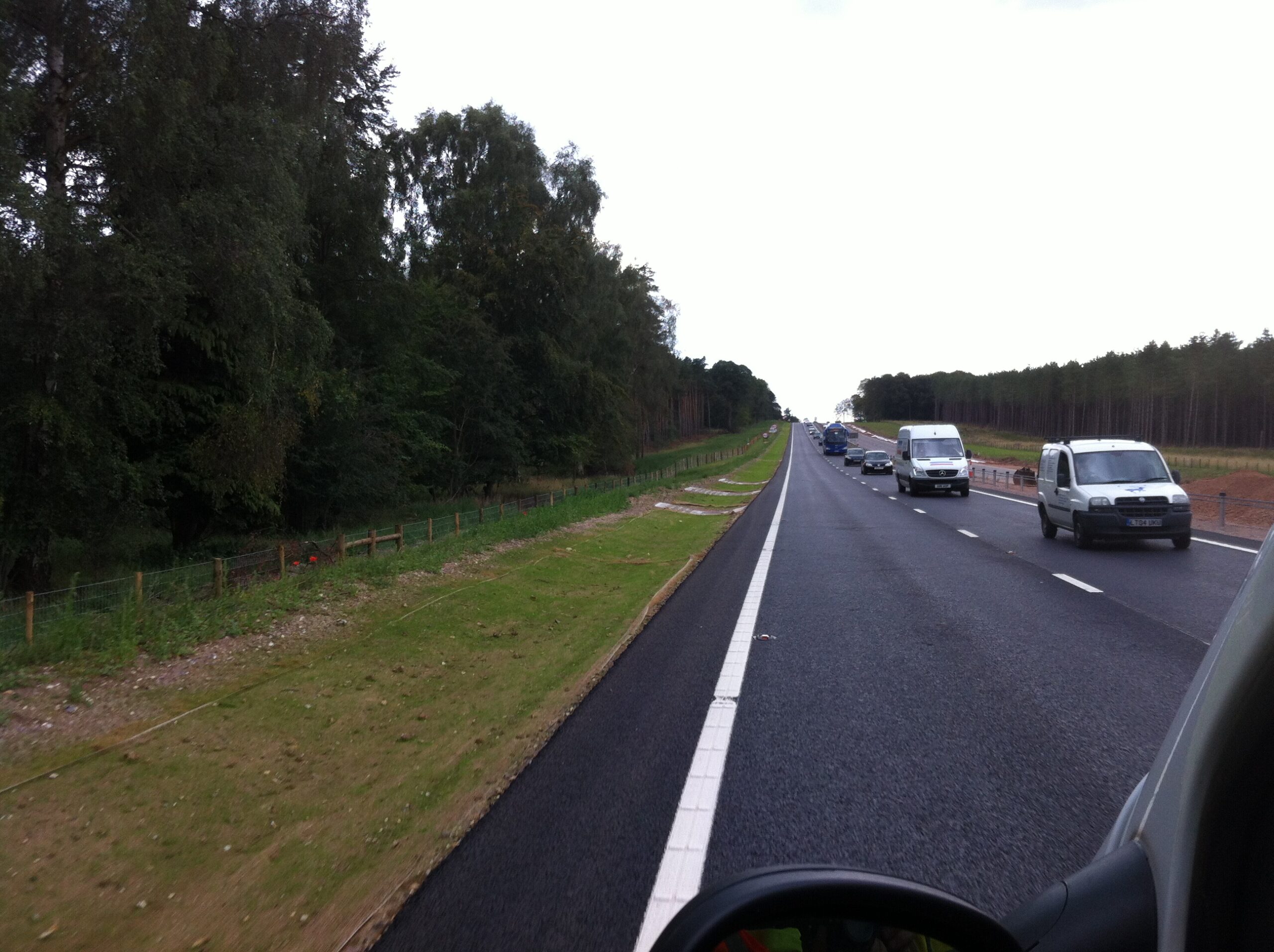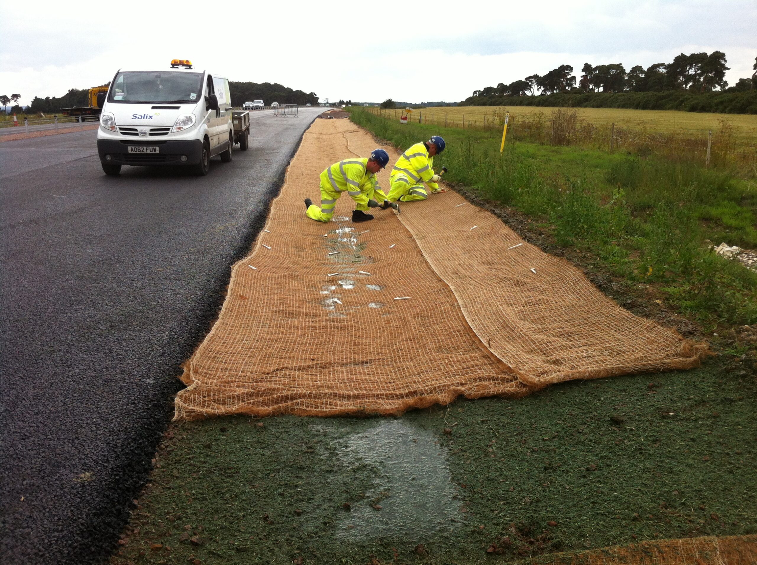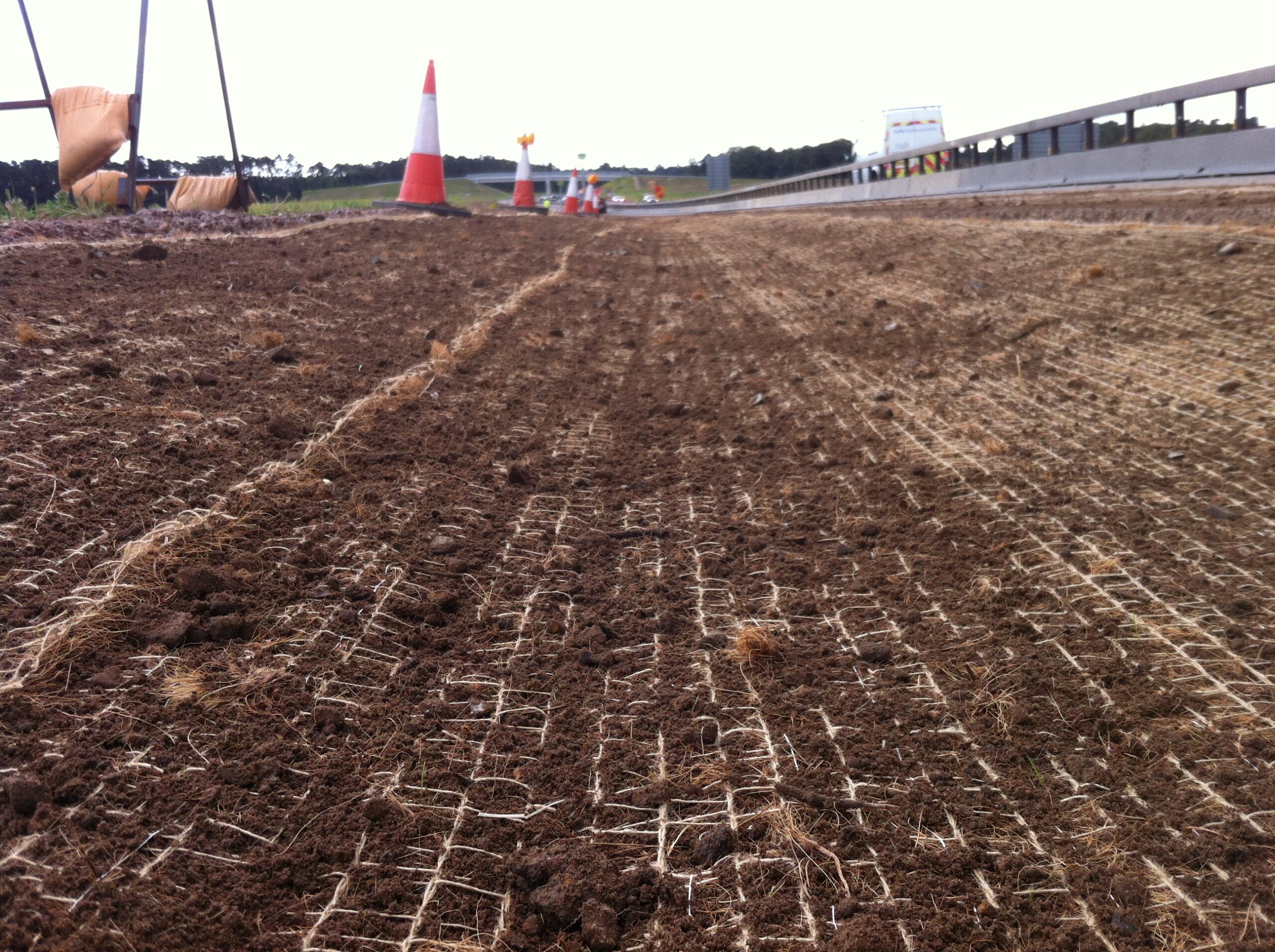 A tough grass selection was added to the straw, cotton, polymer and tackifier mix, these plants could withstand the level of pollution being washed off the road.