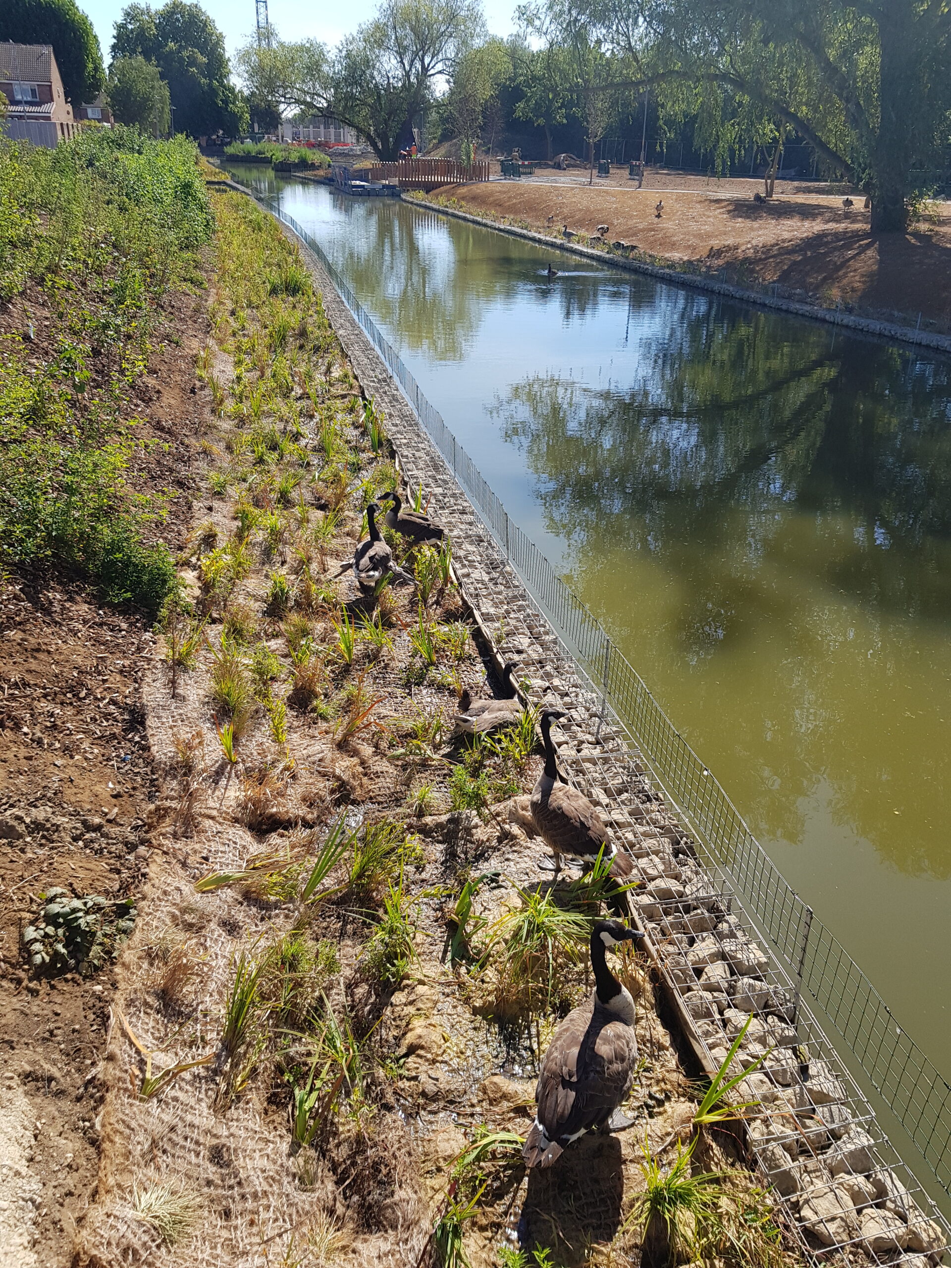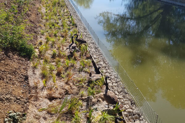 Salix worked with the designers, HTA, to provide a solution, which consisted of creating marginal habitat shelves. New banks were formed within the pond using a retaining feature, with a finish level very close to the water level. Pre-established coir pallets were installed on the new shelves, which provide mature vegetation to rapidly speed up the establishment and increase habitat.