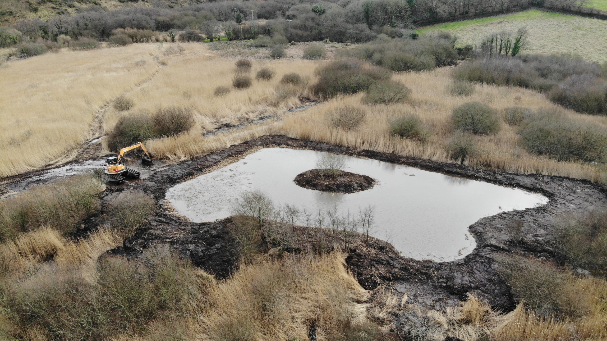 Goodwick Moor, near Fishguard, suffered from habitat loss following continued growth of common reed and willow encroachment. As part of a Pembrokeshire Nature Partnership Project, an opportunity to restore and improve the diversity of the habitat through the creation of a large pond.