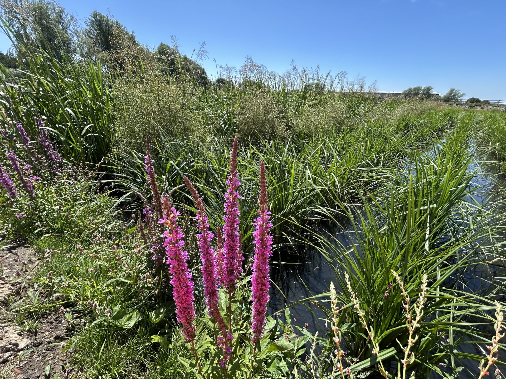 Salix are closely monitoring the site post completion as part of their maintenance plan. Plants are establishing well across the site. With recent periods of drought some cracks have appeared in the soil although around the wetlands and in the channels, there is a clear line of germinated seed and now mature grasses and wildflowers where the soil is moist. Seed has also germinated in small cracks that are formed where moisture is better attained.