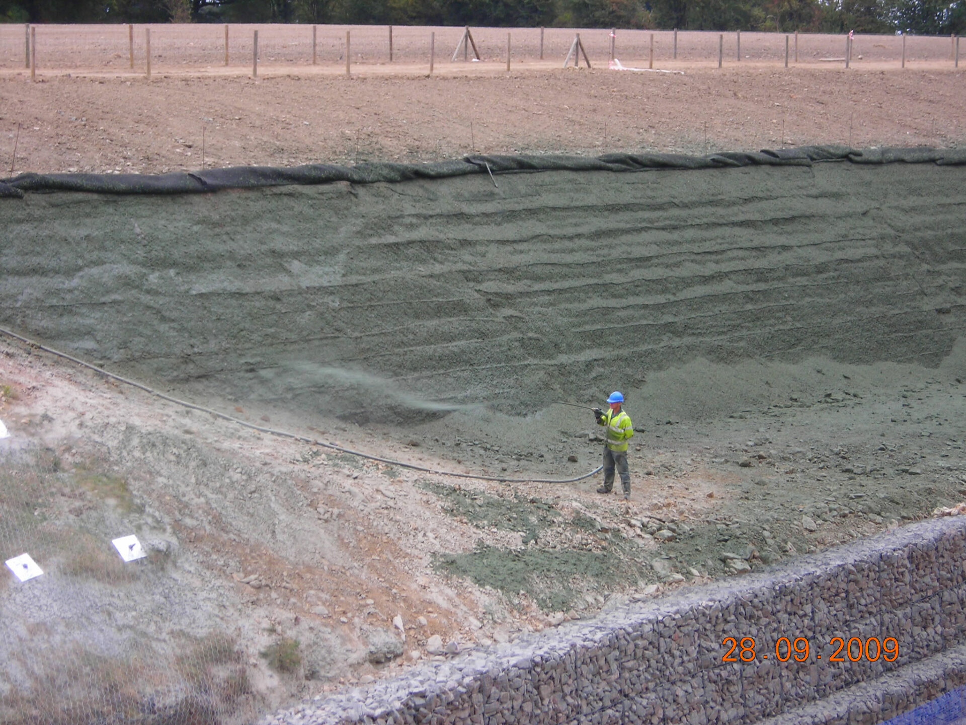 Due to the high stone content on the surface, Salix requested the main contractor to rake the top surface area to expose the fines below. We then sprayed this with HydraCX, our hydraulically applied erosion control blanket. Some areas were nailed and rock netted.