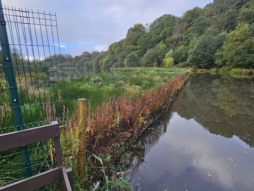Salix mobilised to site and began to construct the linear island from Nicospan. It soon became apparent that the bottom half of the lake had been backfilled with rock and rubble during the construction of the dams during the 1970s. This put the whole project at risk as the stakes supporting the Nicospan could not be installed. Salix met with the council, fishing club and kayak club to openly discuss their requirements and what could be achieved considering the ground conditions.