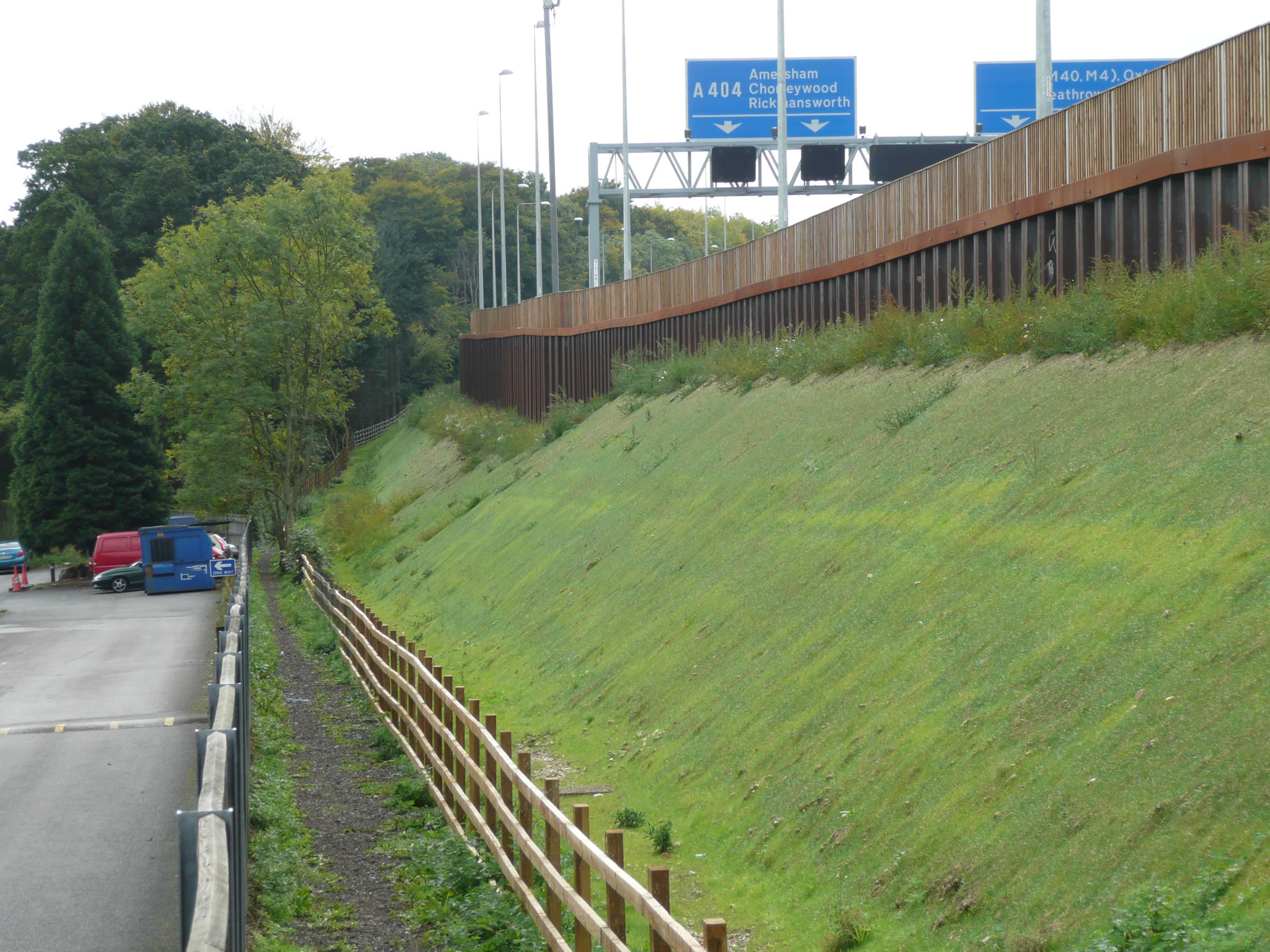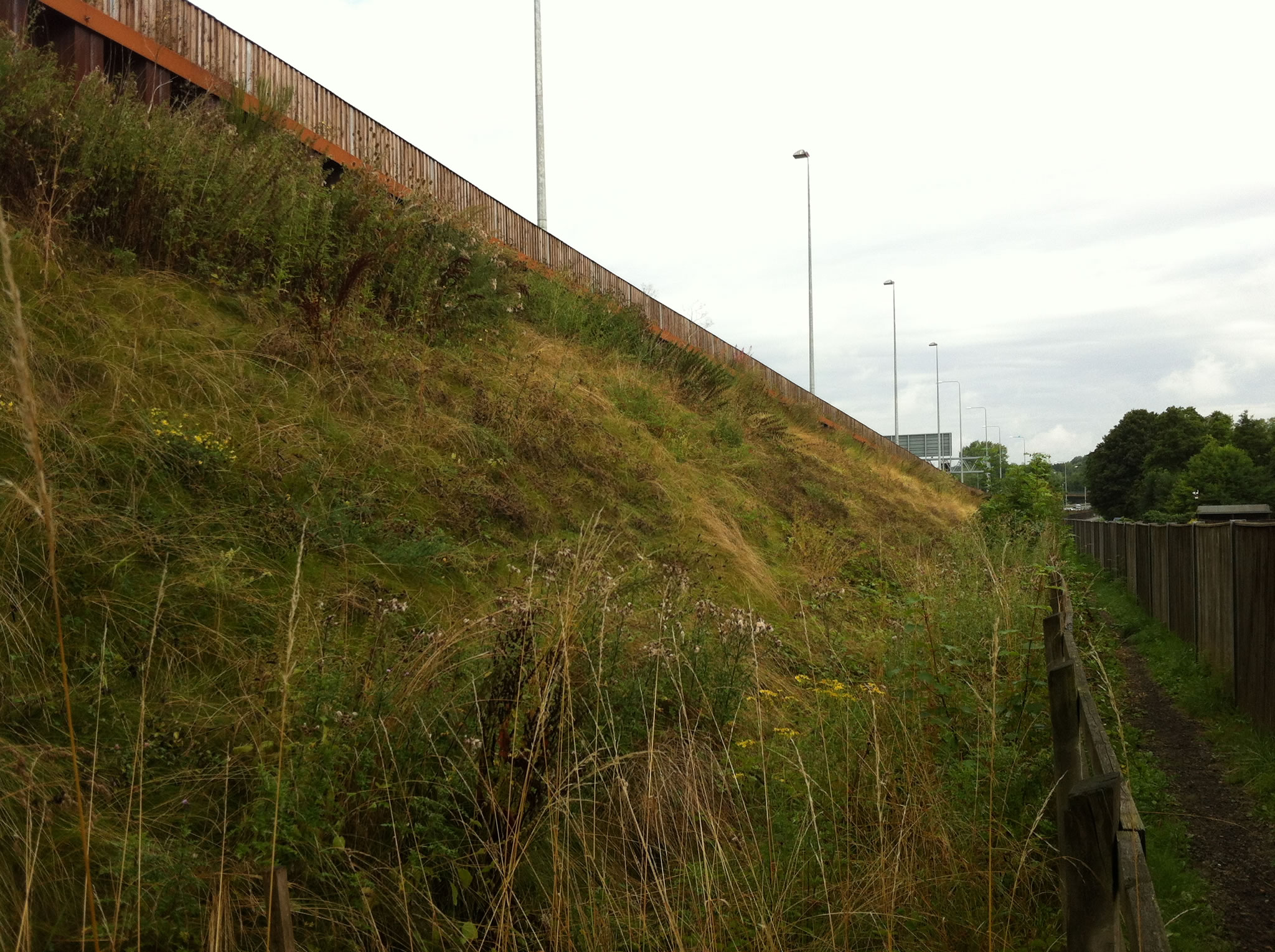 Salix were tasked with greening up a 45 degree slope consisting of 6F2 fill. The initial design was a covering of 150mm of topsoil over an area of about 8,000m2 using a geocell product attached to the surface of the slope to contain the soil and prevent it from slipping. This option is extremely time consuming and expensive to install and then fill with a decent, friable topsoil.