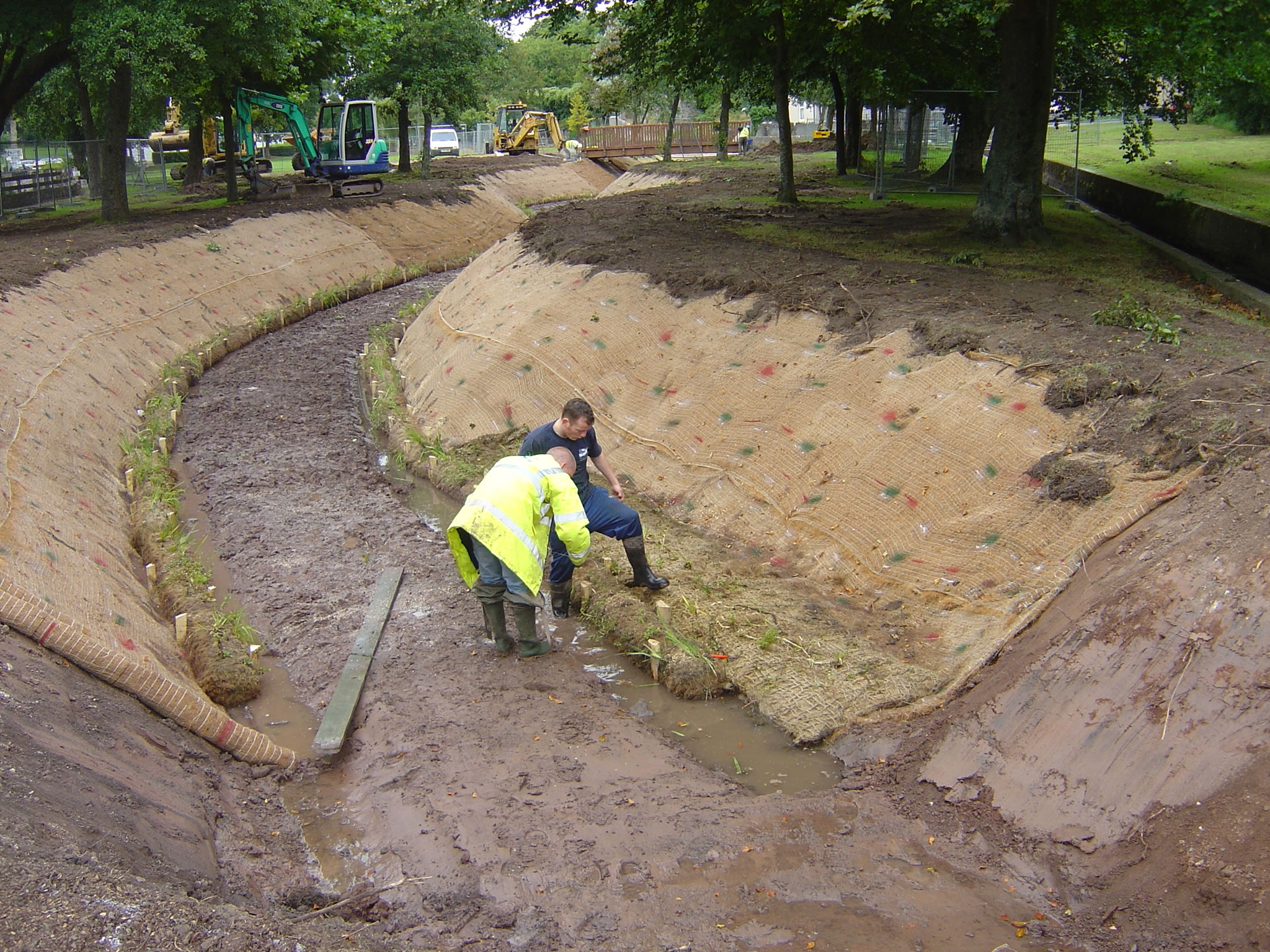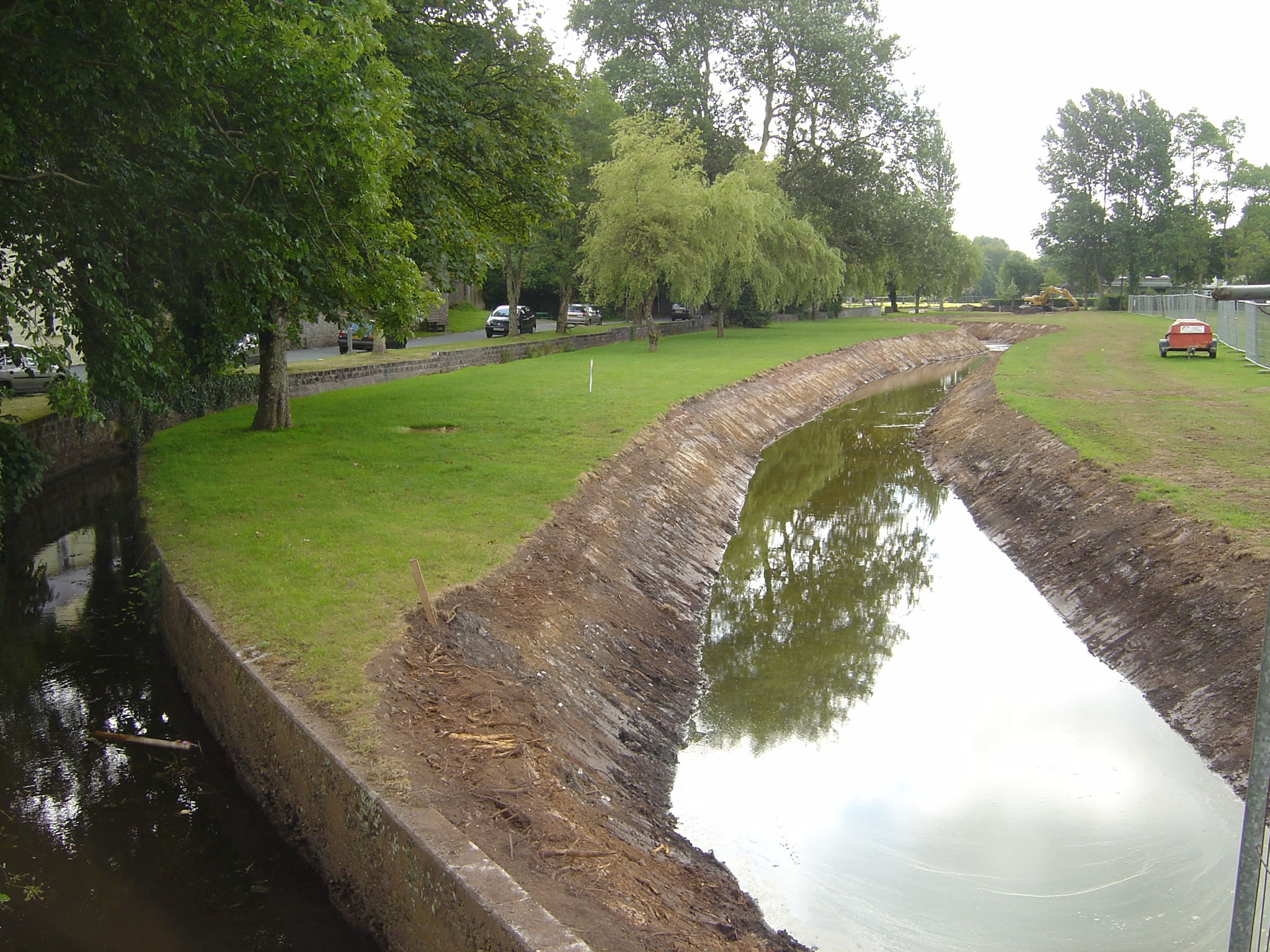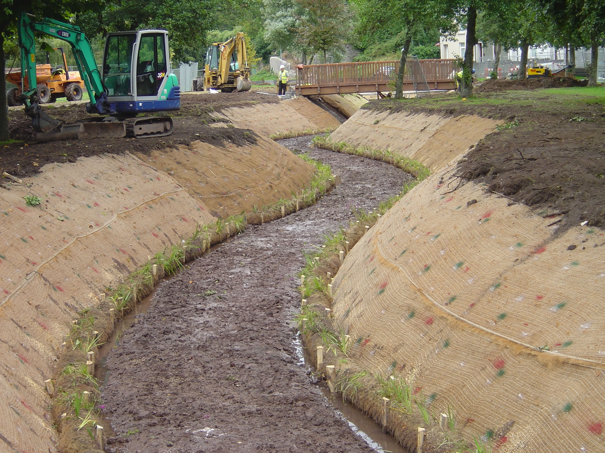 1 km of new and existing channel was enhanced using bioengineering techniques as part of a flood protection project in the centre of historic Pembroke in West Wales. The upper reach of this small stream previously ran in a confined concrete U channel.