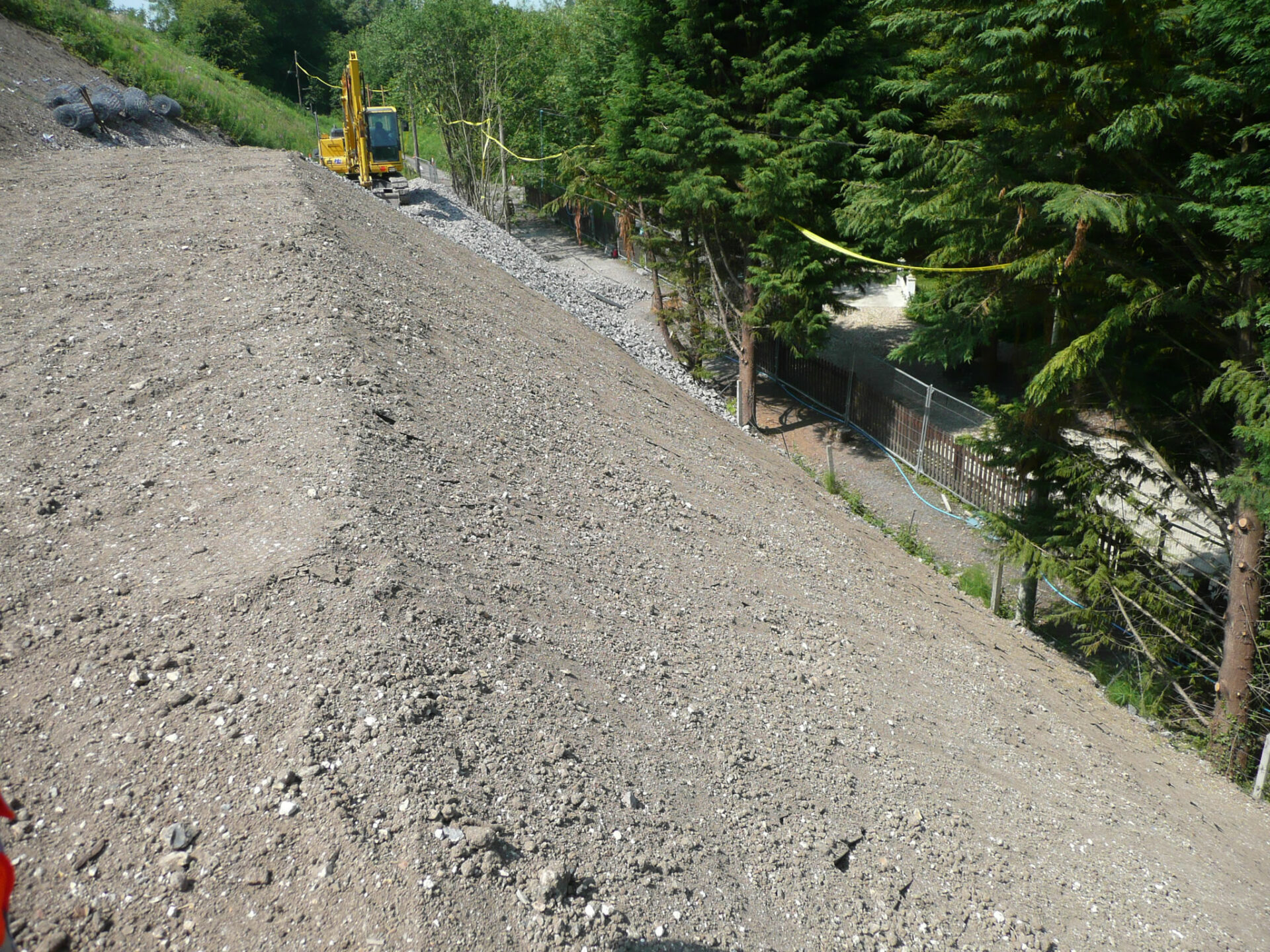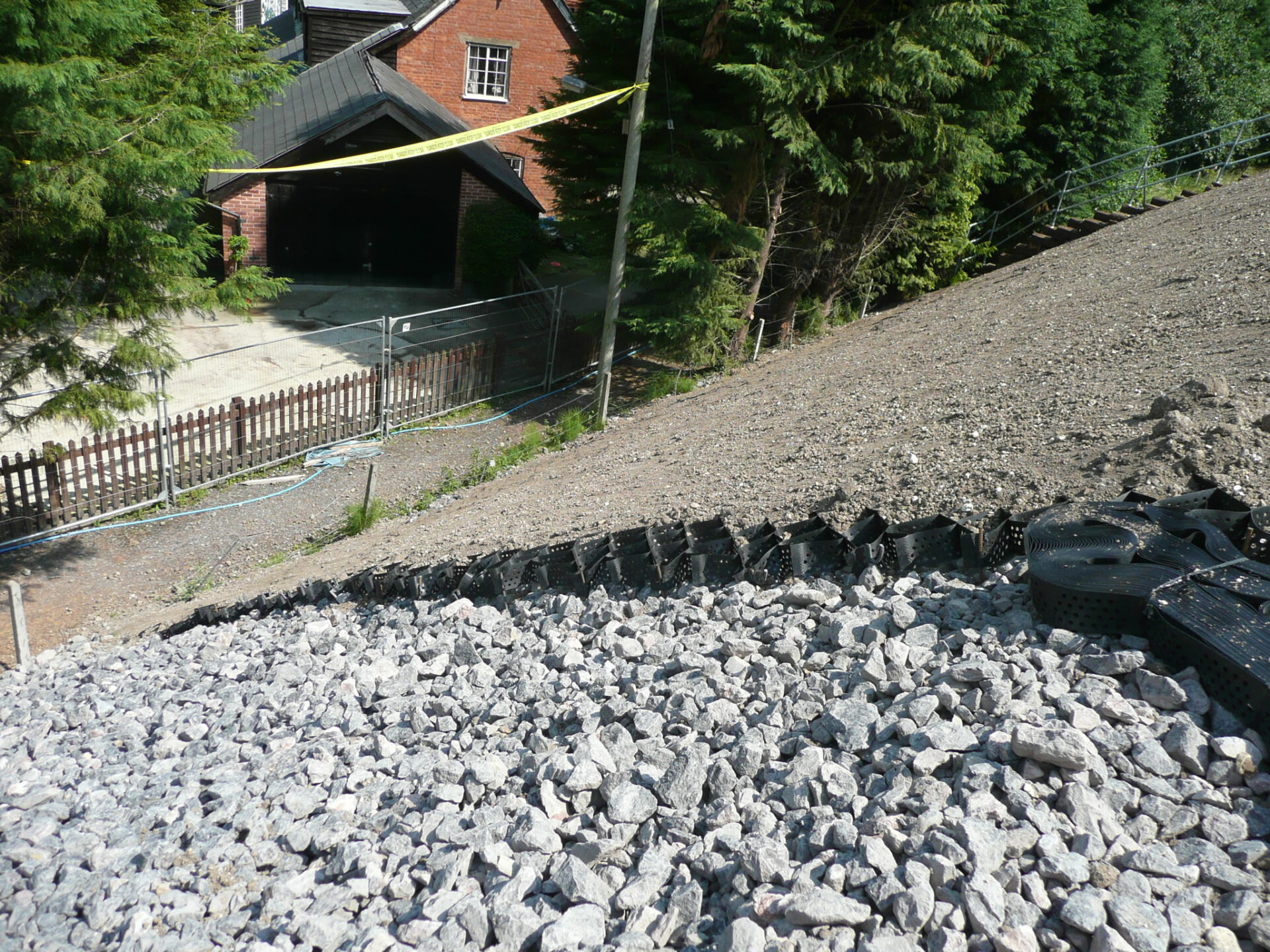 A rail embankment had slipped and was reinstated with soil nails providing geotechnical stability. Birse created working platforms with imported stone and then used a soil cell system to retain about 150mm depth of soil on slopes up to 43 degrees. In order to prevent soil erosion and allow vegetation to rapidly colonise the area, Salix applied HydraCX to the soil surface.