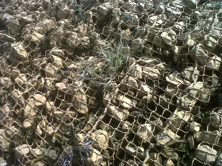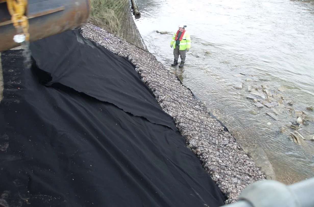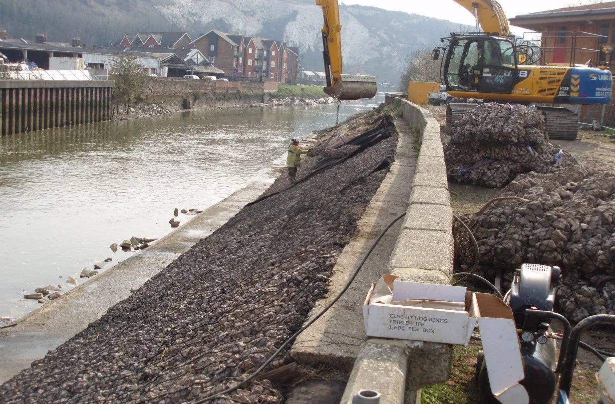 The Salix Rock Mattresses are all butted and mechanically stitched together with “hog rings” so as to form one continuous flexible revetment.