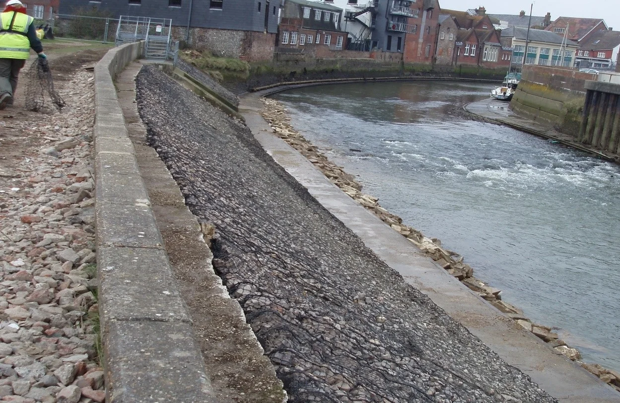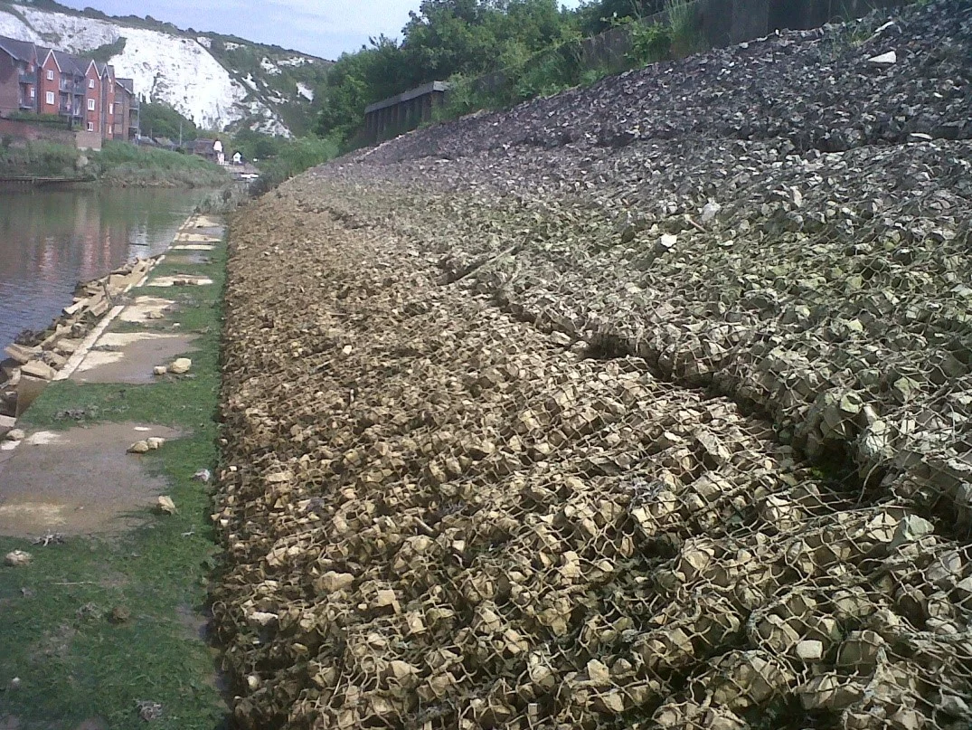 The Environment Agency are responsible for the river bank stability at Railway Lane, Lewes. The integrity of the existing blockwork facing was deteriorating as a result of the tidal inundation and draw-down cycles together with areas of groundwater seepages emanating from the slope profile.