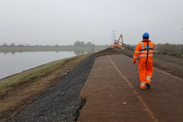 The solution chosen was to reprofile the inner face along this length of the embankment and then protect the surface by the placement of ready filled rock mattresses with Vmax C350 installed above.