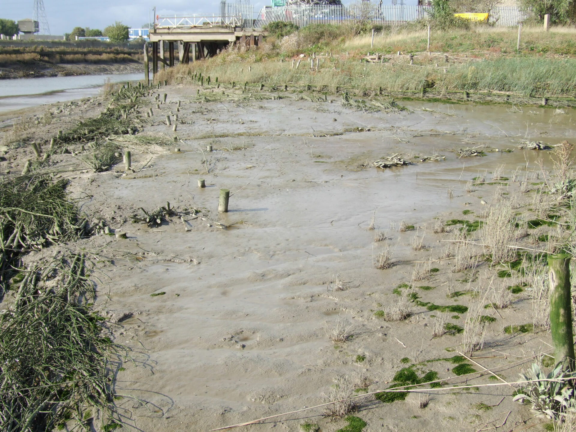 Naturally, seed within the inter-tidal sediments is deposited and colonises. Brushwood fascines or unplanted Coir Rolls can be used to create sediment traps to build up sediment after each inter-tidal event. In the case of the River Roding two techniques using Brushwood fascines were used.