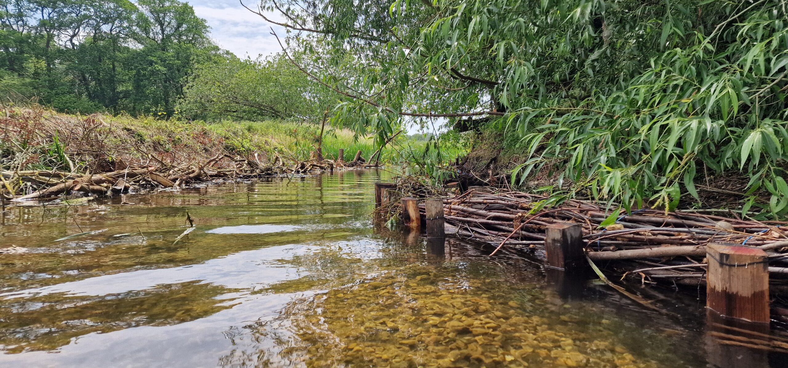 Spanning seven distinct reaches, the works focused on a series of in-channel and riparian enhancements designed to restore natural processes and habitats. Brushwood berms were constructed by regrading the riverbanks and protecting the leading edge with locally sourced brushwood, secured using chestnut stakes supplied by Salix. These berms not only stabilised the channel but also created valuable new habitat for marginal vegetation, improving biodiversity and flow variability across the reach. Alongside this, gravel riffles were installed to enhance spawning grounds and provide refuge for fish species, while selective tree thinning increased light penetration and encouraged stronger vegetation growth along the river margins.