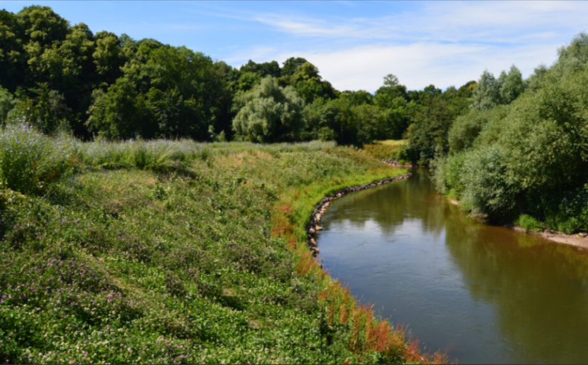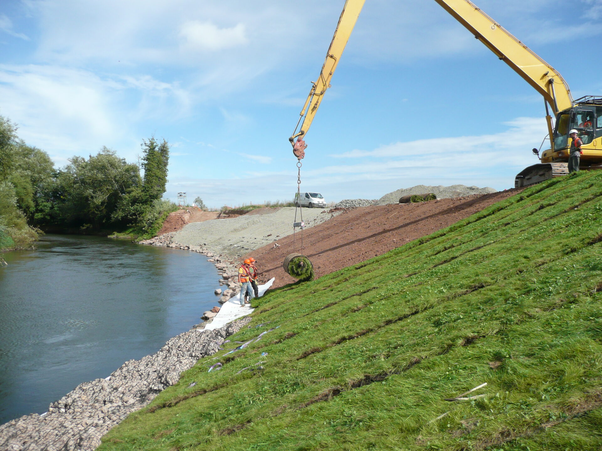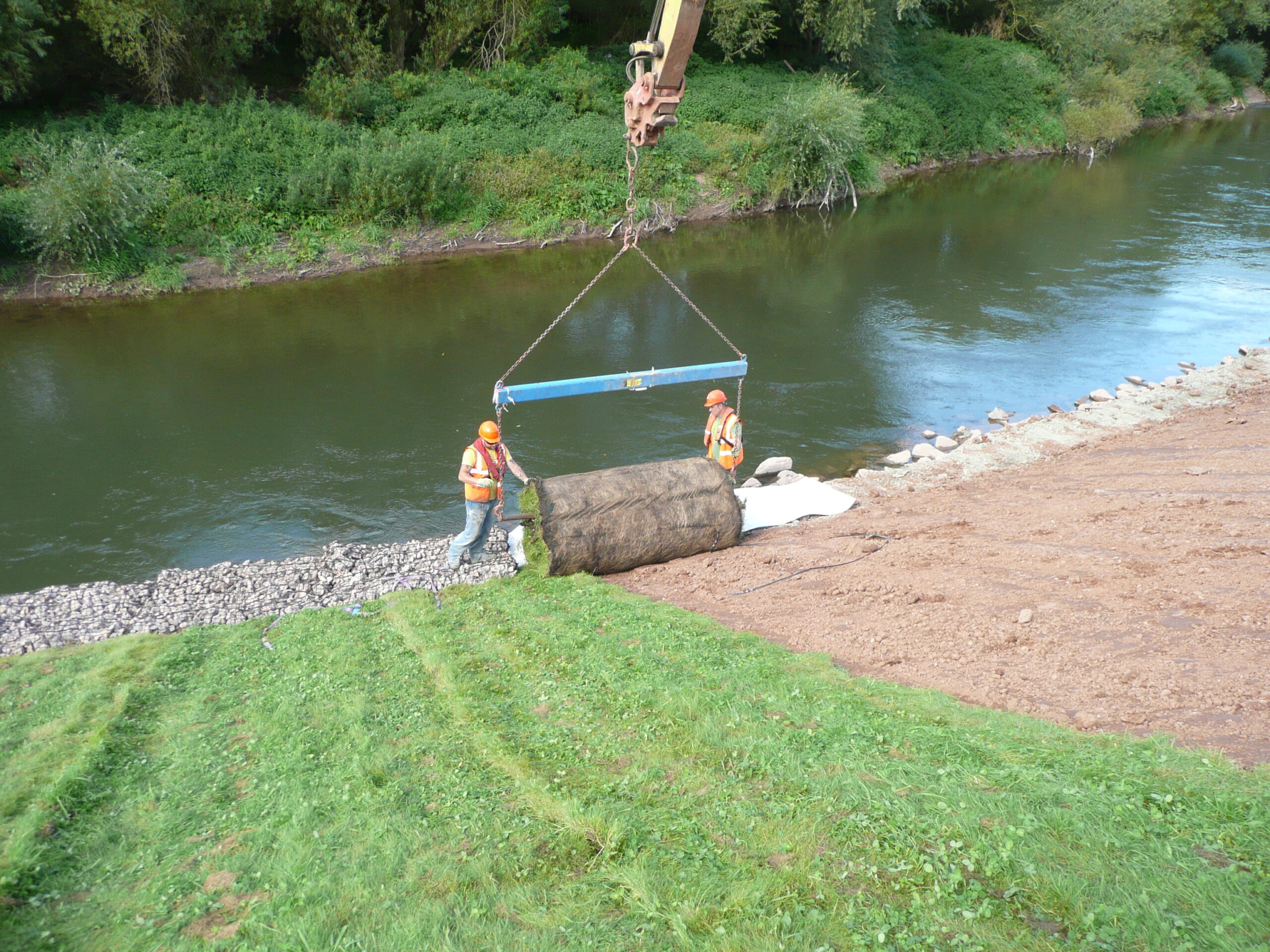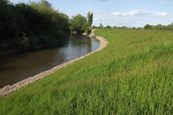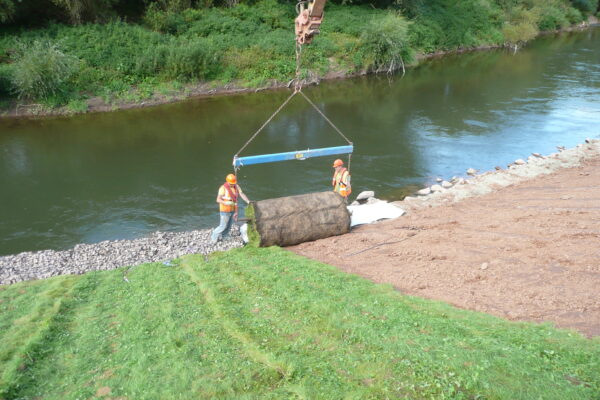 The alternative to work on the opposite bank was a 2.2 km access track across wet ground involving importing and then removal to landfill of two thousand tonnes of imported haul road material. Thus, over two thousand tonnes of aggregate were saved from the project. We identified this significant cost and carbon/sustainability saving as part of our sustainability review procedures. Tree limbs removed for access were reused as part of the soft engineering revetment. Salix grew in-house over 2000m2 of reinforced grass/wildflower turf on 40m2 large rolls to provide soft engineering protection above average low water level. The high erosion control performance of this turf meant that a soft solution could be used as a direct alternative to rock rip rap, saving over one thousand tonnes of imported material whilst creating a more sustainable and ecologically valuable solution. The various soft engineering solutions presented by Salix represent a major cost saving over traditional hard revetments. Our Health & Safety risk assessment set maximum water levels and monitoring levels were installed at key working areas to determine safe working conditions.