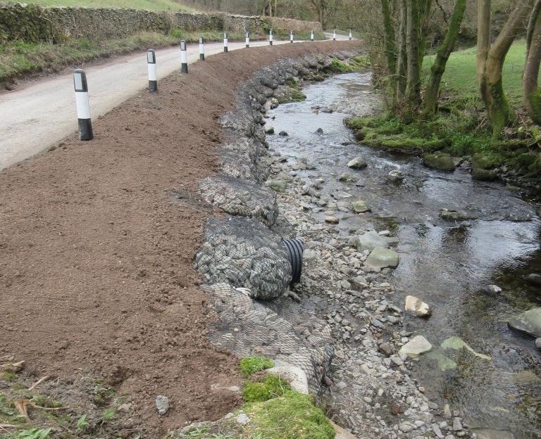 AquaRockBags® were installed by the local council highways team to prevent a road subsiding due to scour and erosion caused by the adjacent watercourse.