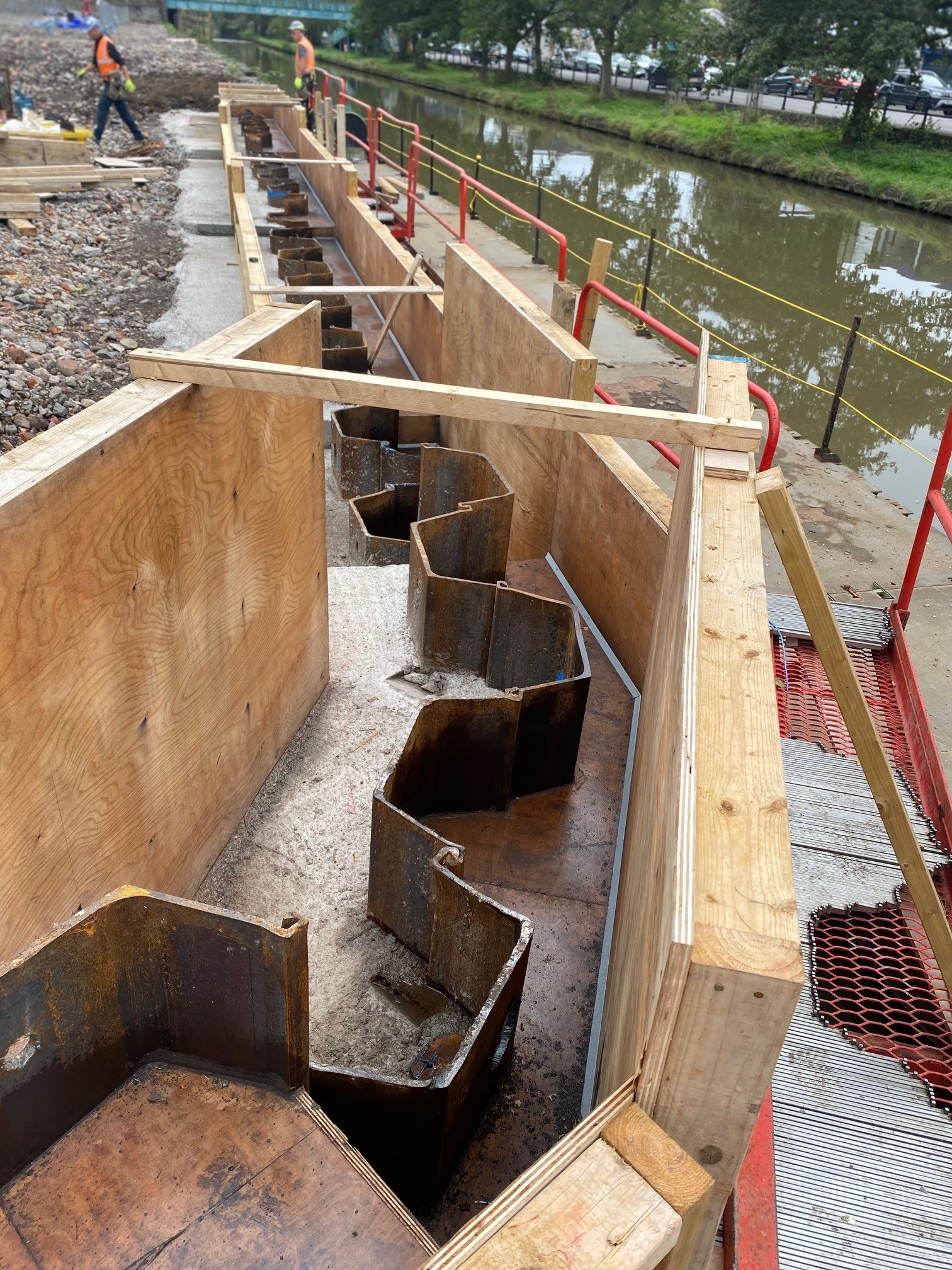 On the waterside, we utilised the Dawsons sheet pile capping beam system to create our platform. This was set at various levels to account for the 4 No. of level changes in the finished level of the capping beam, which was to be utilised for surface water runoff.