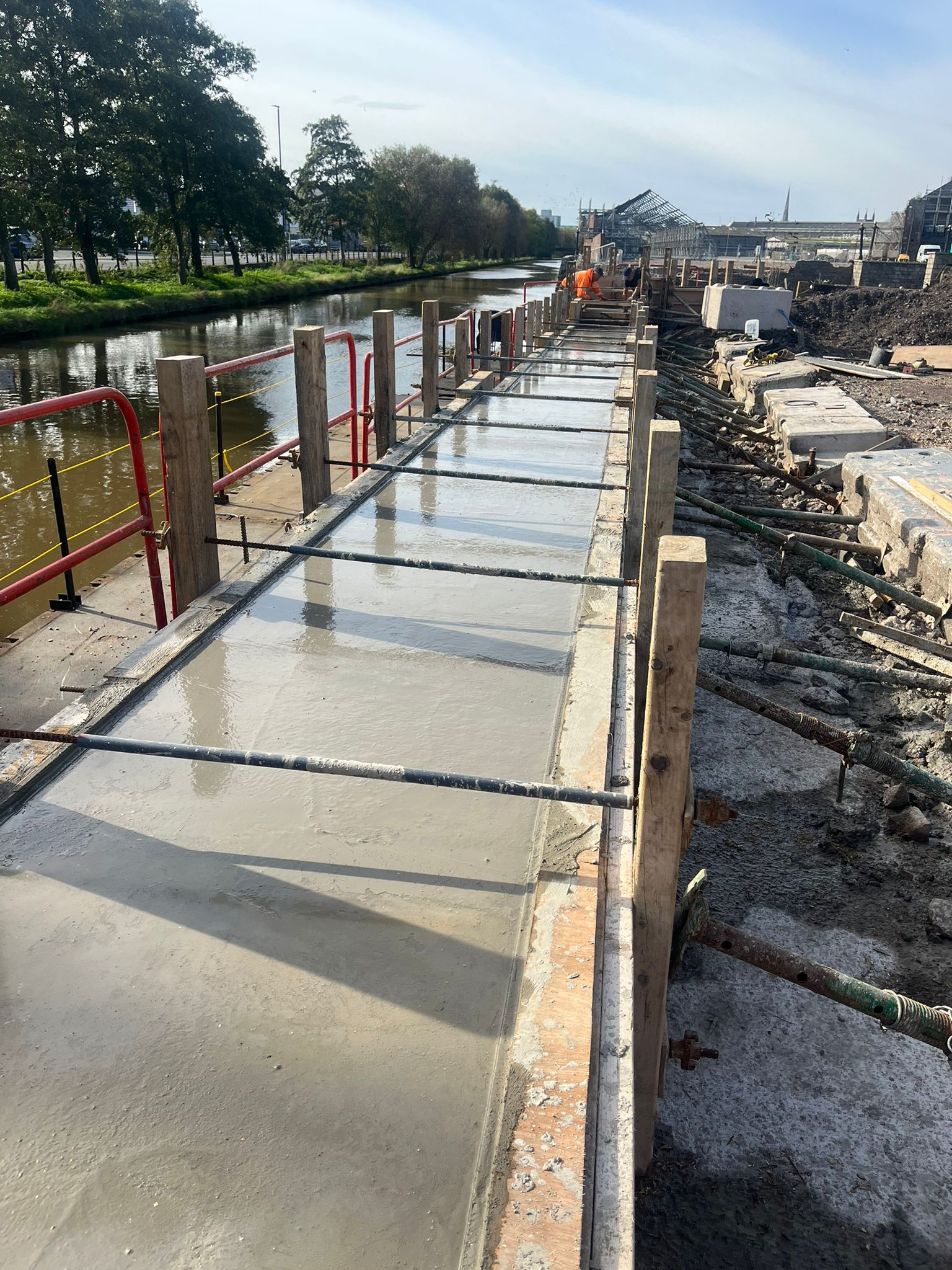 We backfilled the sheet piles with a self-compacting gravel up to the underside of the formation level for the capping beam, leaving a gap for shuttering installation. Blinding concrete was installed landside to provide us with our level for the concrete capping beam shuttering. To ensure that the gap between the new and existing structures was fully sealed, we used mass pour concrete.