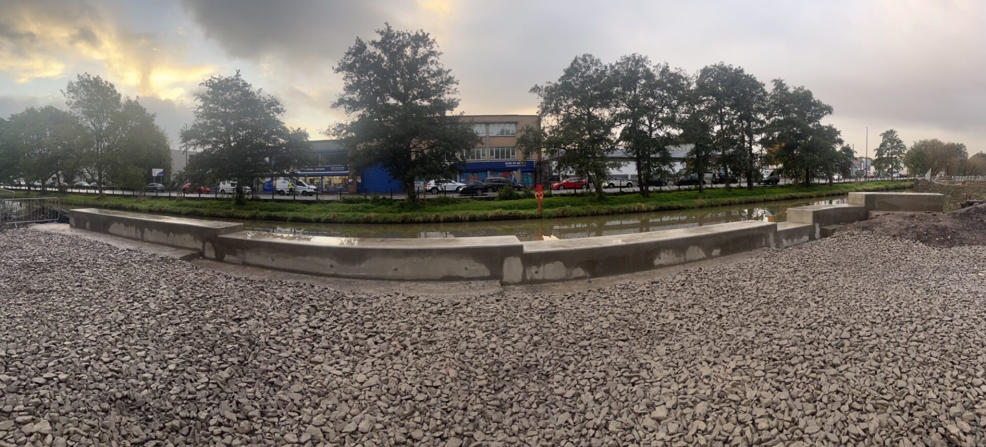 The new wall section needed to tie into the existing stone wall which was failing in many places. During the design period the tie-in points to the existing stone canal wall were overgrown with dense vegetation, requiring us to set out and agree the final tie-in points on site. Due to protracted stakeholder approvals, Salix mobilised to site in July 2023.