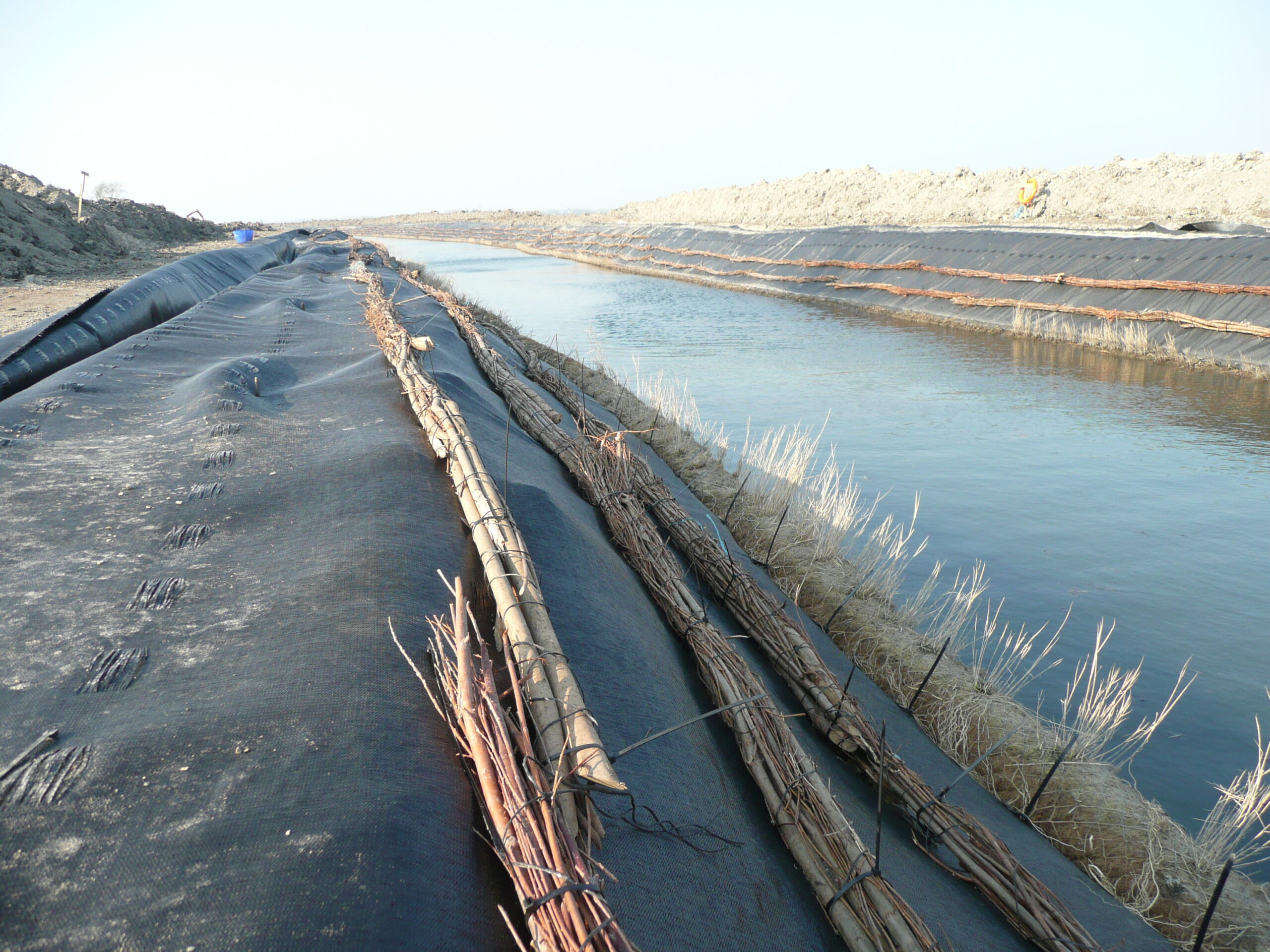 The liner prevented stakes being used and created a slippery surface for soil placement. Therefore, a woven loop geotextile was used over the liner in order for Coir Rolls and brushwood fascines to be tied onto the loops.