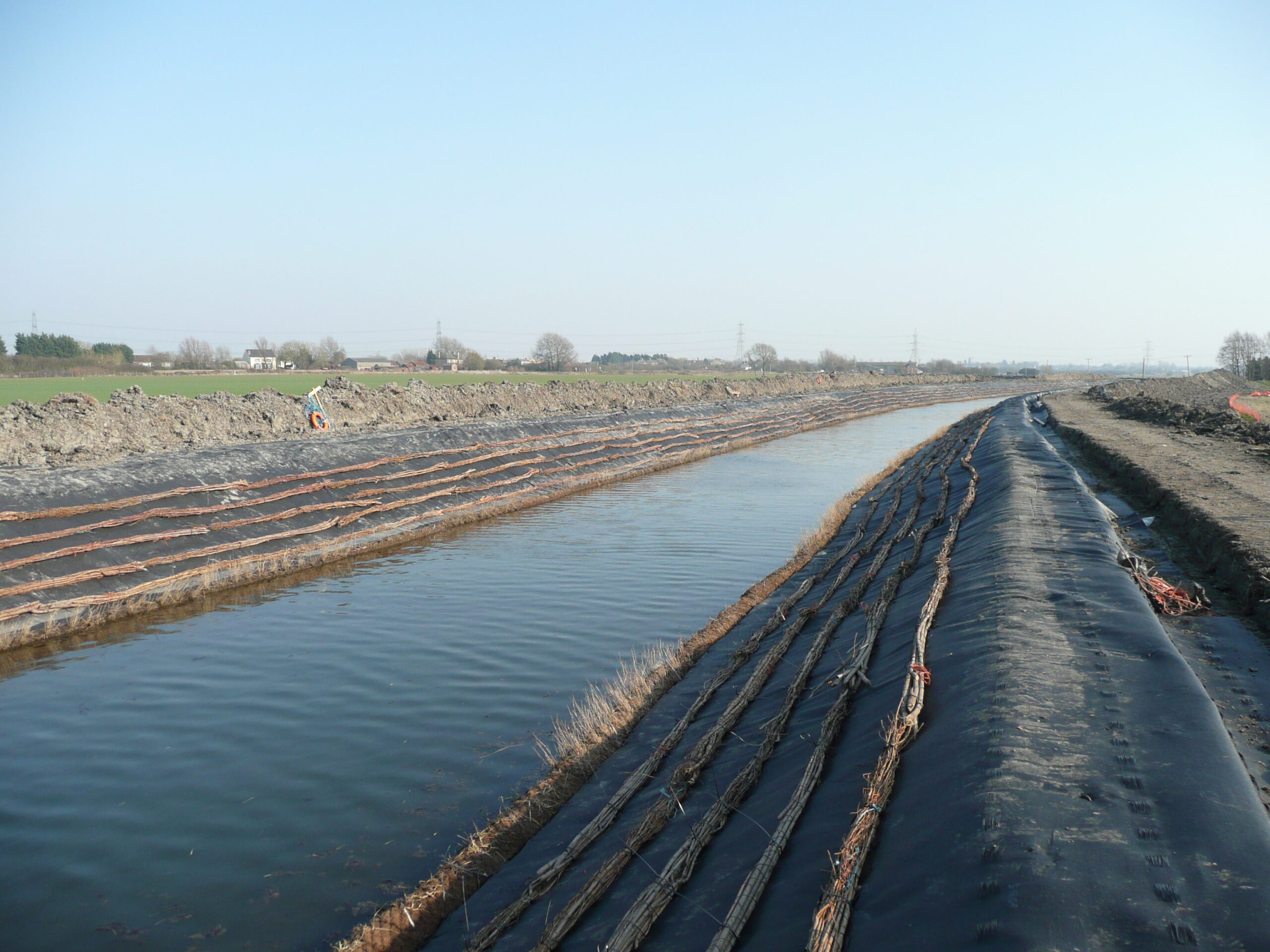 The brushwood fascines created a physical barrier preventing the soil fill placed on the banks slipping down the slope. A total of 1200m of pre-established Coir Rolls was placed along the toe of each side of the re-lined section to form dense marginal planting.