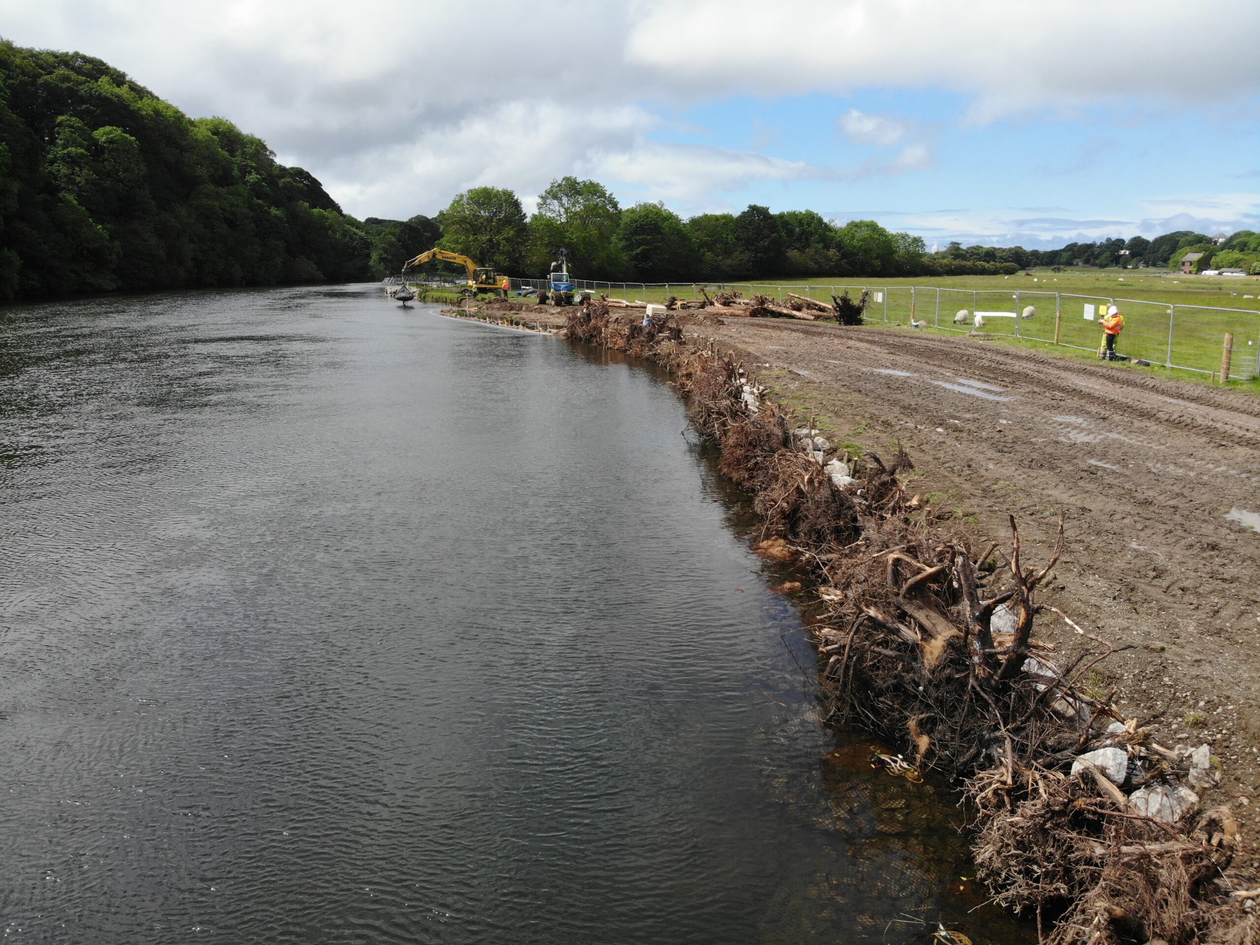 From average low flow water level, a continuous run of linear toe logs, rootwads and live willow staking were installed. Additional tree planting on the reprofiled river banks and the adjacent floodplain will slow flood flows and reduce erosive force in the future.