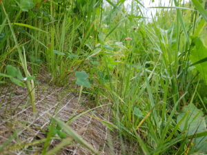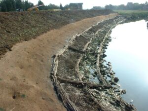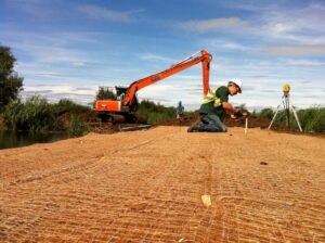 The dense layer of coconut fibre stitched between the woven jute netting enables C125BN to provide more effective erosion protection from day of installation compared to open plastic systems that require friable soil filling. C125BN is also better suited than our woven coir netting, Coconet800 when 100% surface coverage is required. I.e. no open apertures when very fine sediment/clay particles/silts are an issue. C125BN can be installed onto a well prepared, seeded soil surface on shorelines, flood banks, riverbanks, SuDS and embankments (N.B vegetation will need to establish for long term protection).