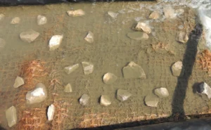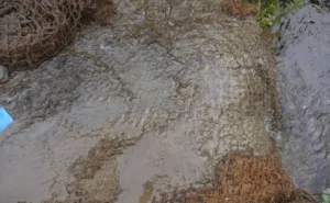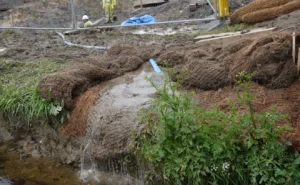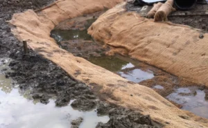 FlocMats can be spread on the channel bed and are easy to manipulate due to their 1m x 2m size. They can be positioned over rock checks and also within a channel, creating a permeable curtain. This helps to slow the flow of higher energy streams and provides opportunities for sedimentation.