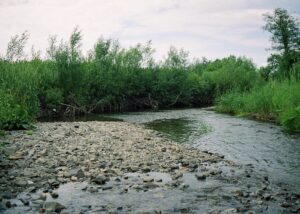 A live willow brush mattress is capable of withstanding very high flow velocities and is therefore suitable in higher energy, mobile gravel bed rivers. The branches absorb flow energy, trap sediment and seed and as a result evolve with high biodiversity value. River scale flume trials undertaken in Austria demonstrated that this revetment, with one season’s growth, could withstand velocities over 5 m/s.